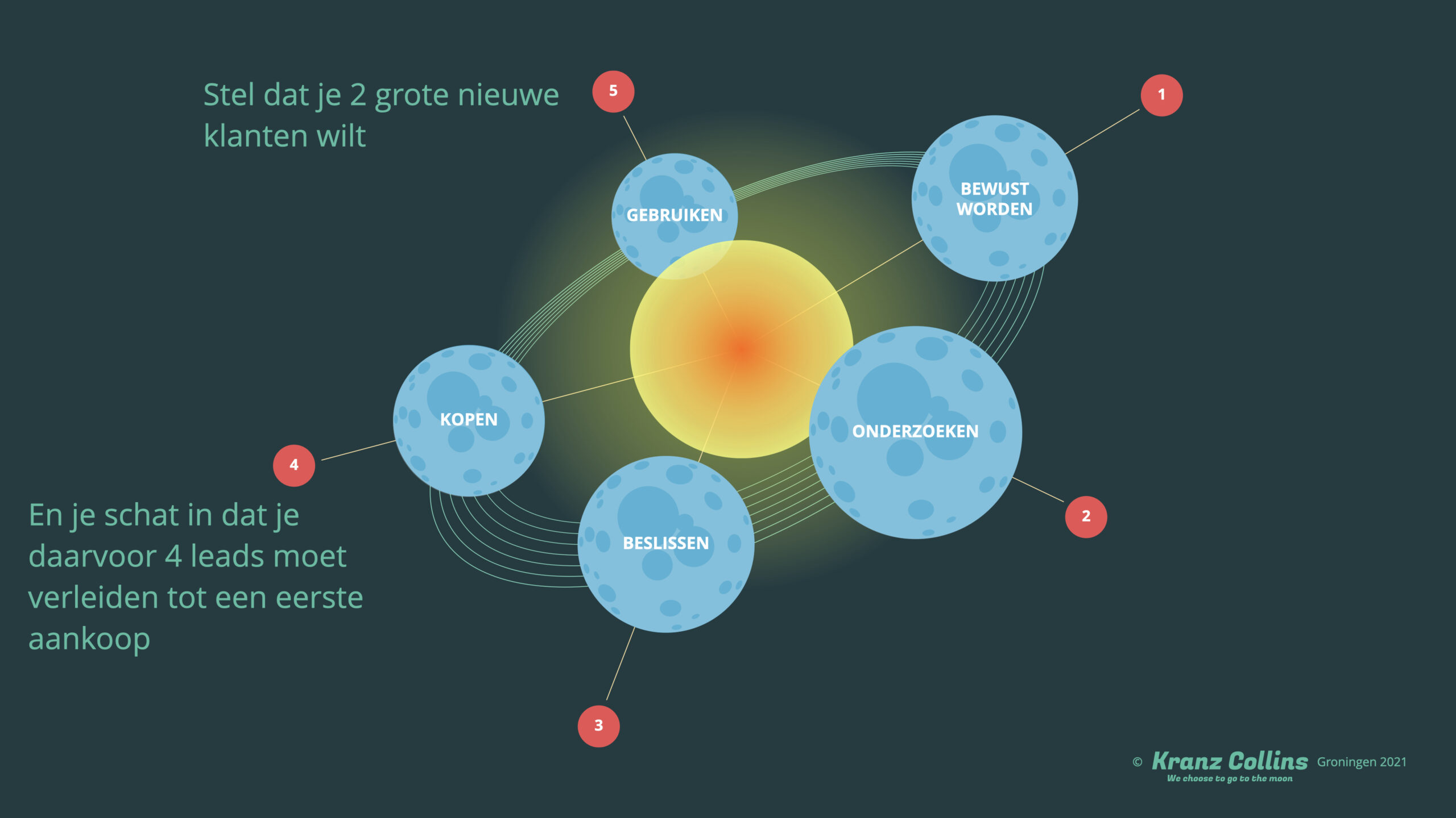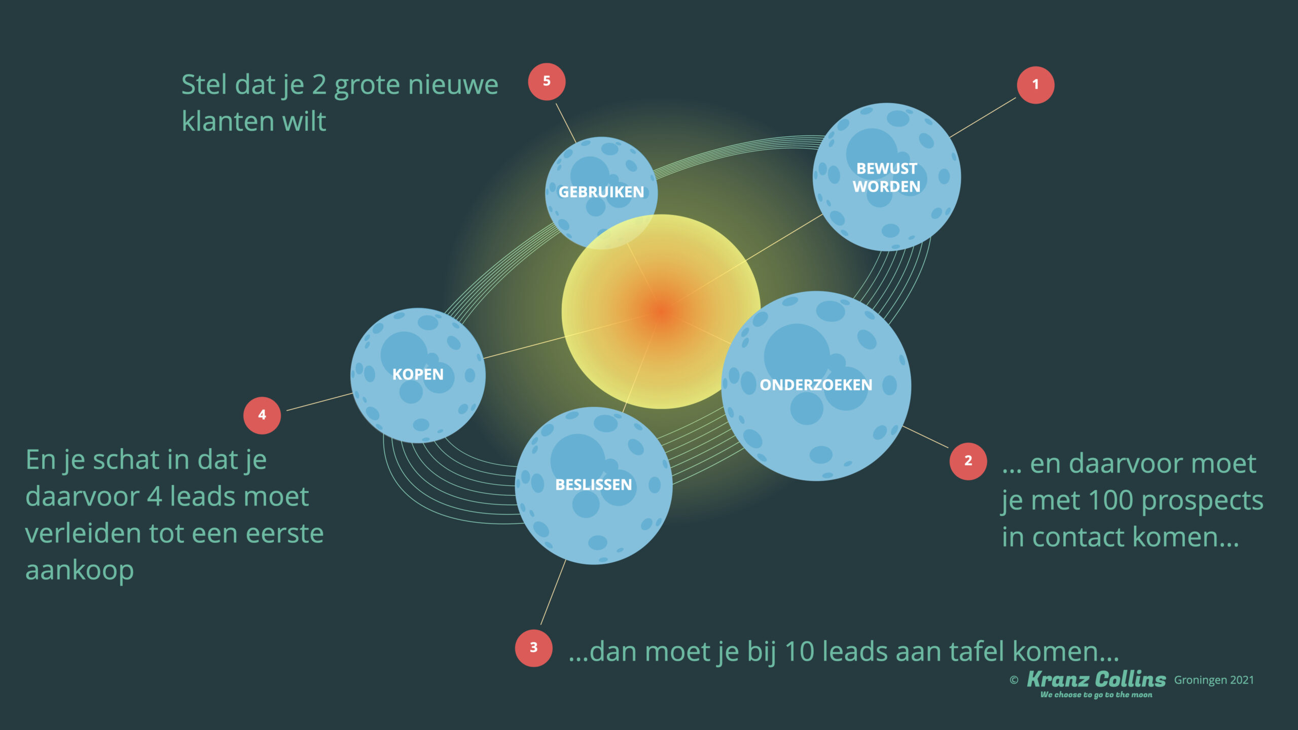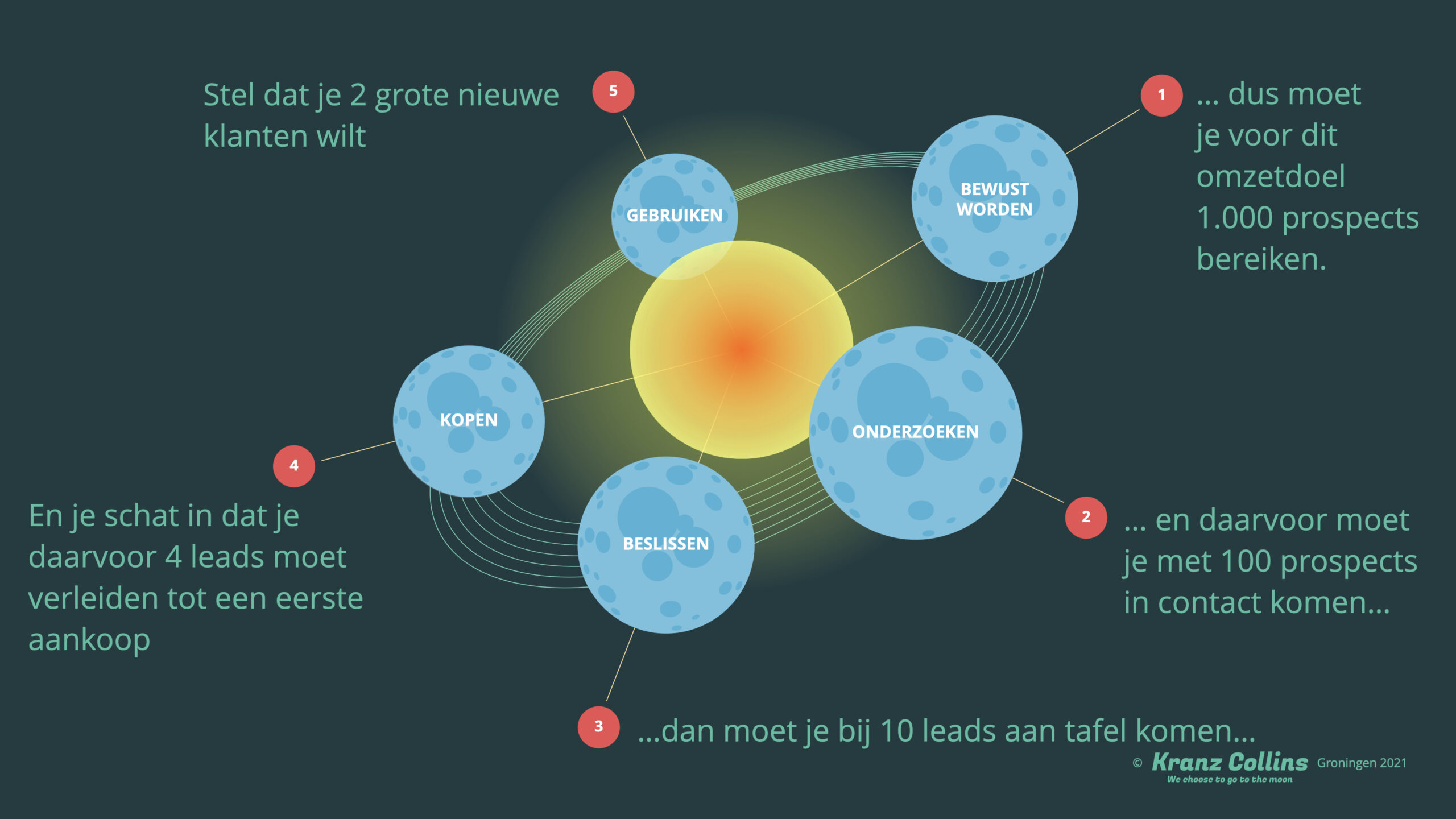 Terug naar de praktijk met een voorbeeld van Cees Mostert. Hij wil in 5 jaar zijn omzet verdubbelen. Om dit te bereiken moest hij begin 2021 5 bestaande klanten upsellen naar het niveau van Super Mario. Voor de komende salesperiode richt hij al zijn pijlen op het binnenhalen van 2 nieuwe Super Mario’s.