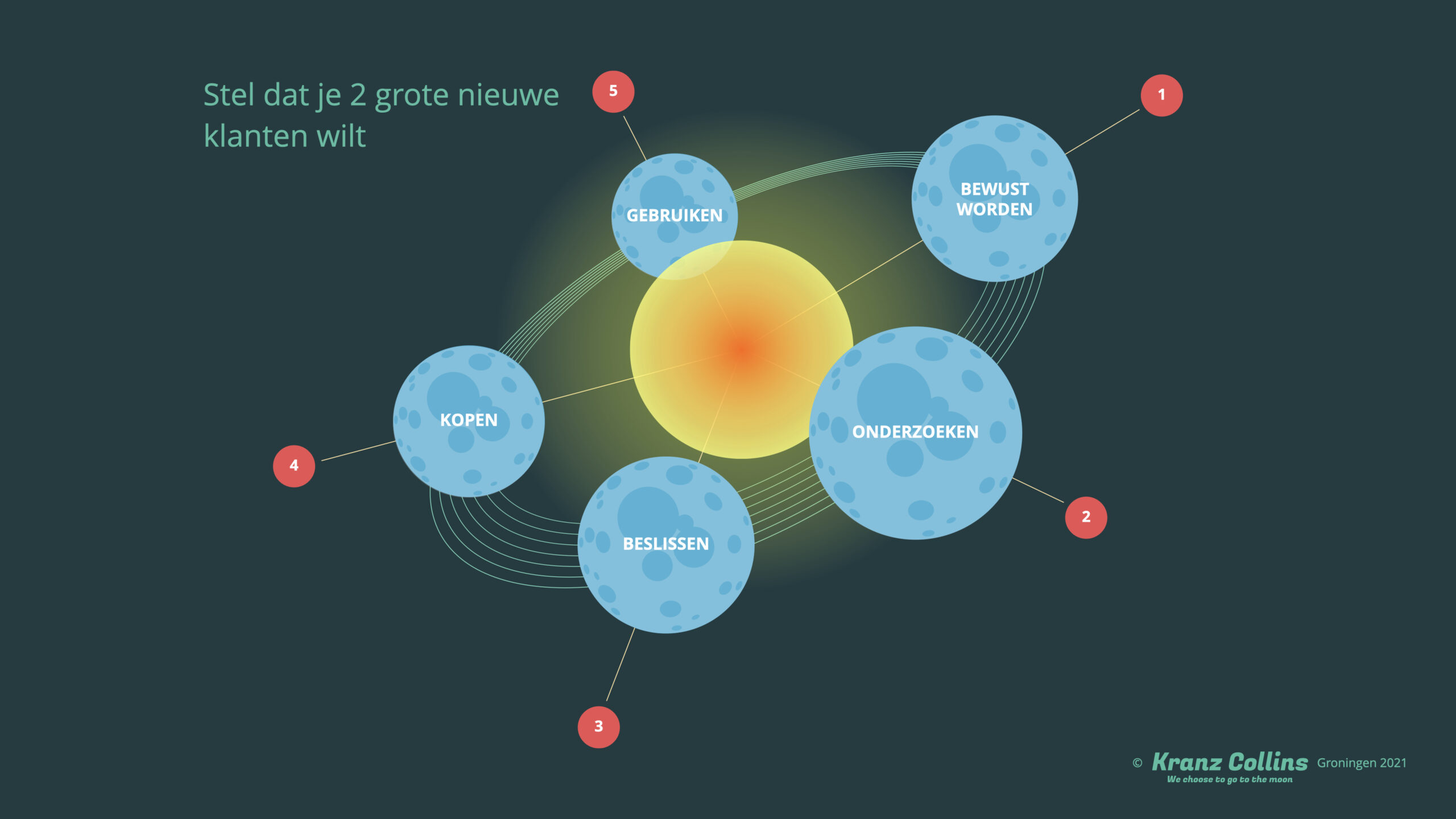 Je favoriete klant komt meestal niet zomaar aanwandelen, daarvoor moet je je marketing- en salesmachine aan het werk zetten. Dat zie je hieronder in de 5 ‘werelden’ van de klantreis:
